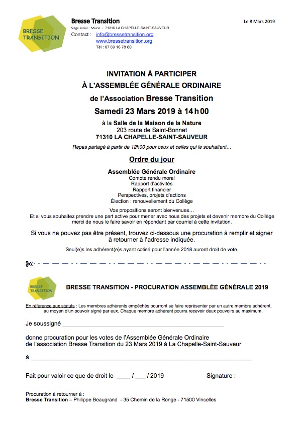 INVITATION À PARTICIPER À L’ASSEMBLÉE GÉNÉRALE ORDINAIRE de l’Association Bresse Transition Samedi 23 Mars 2019 à 14h00 à la Salle de la Maison de la Nature 203 route de Saint-Bonnet